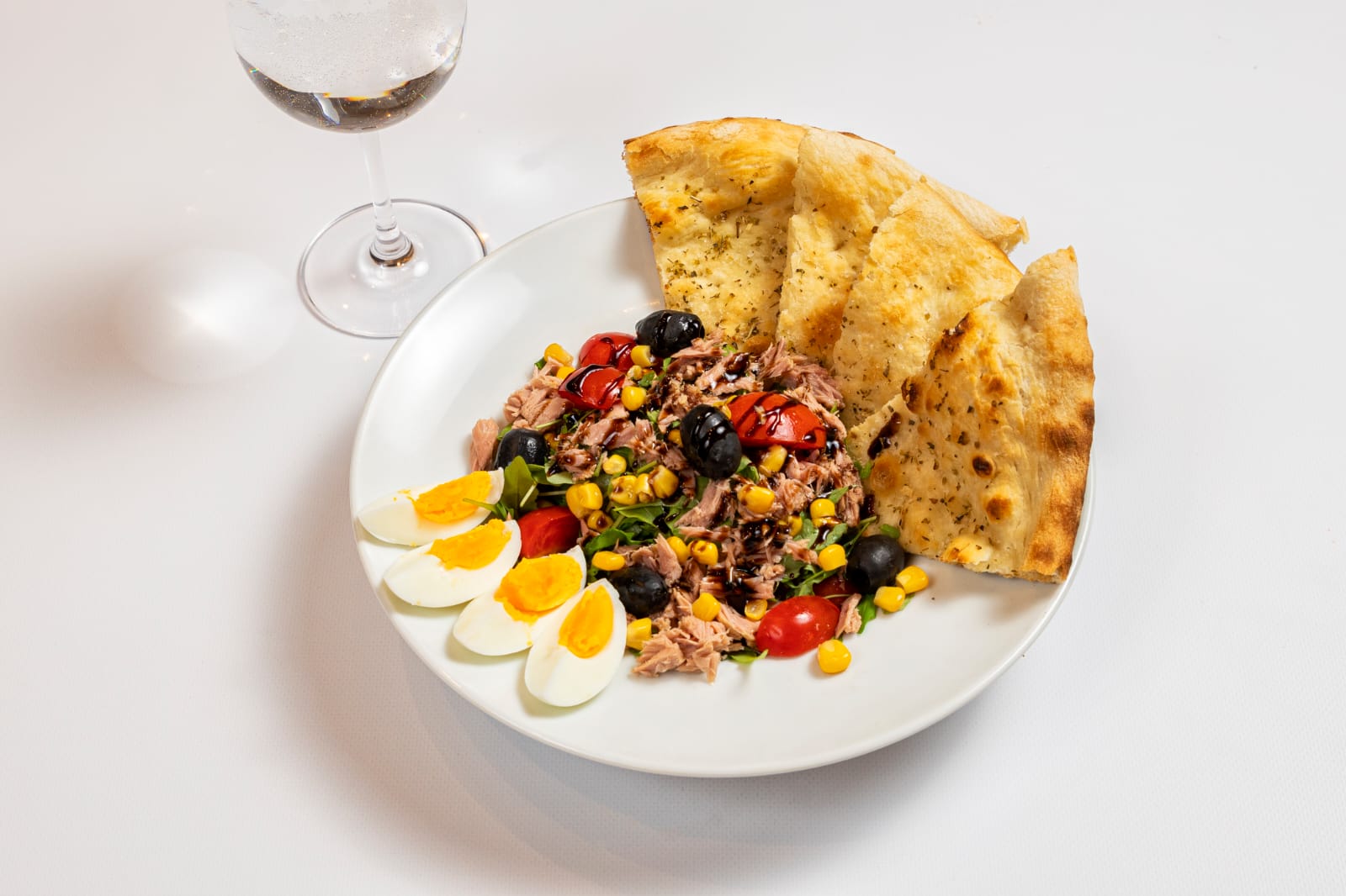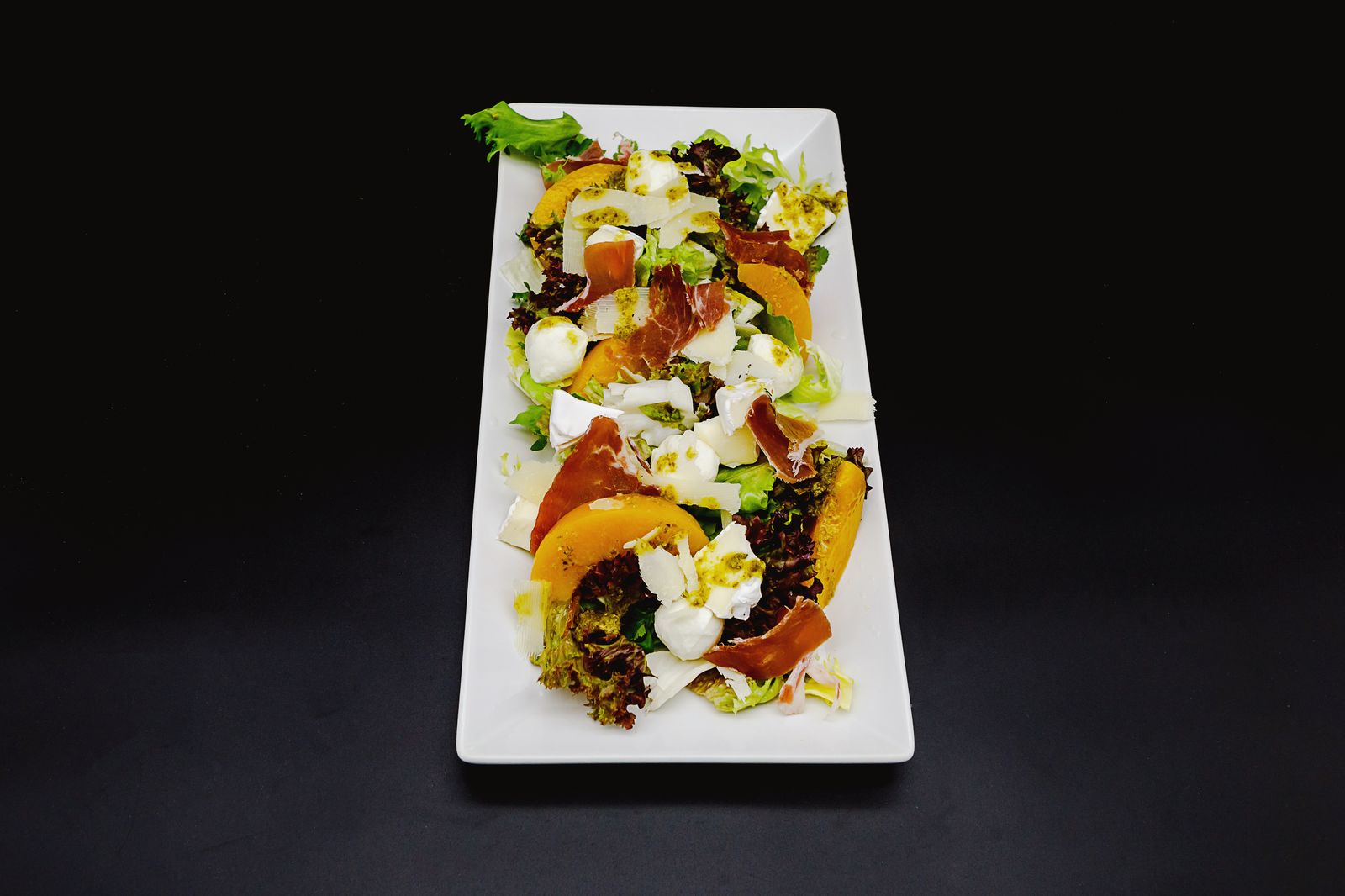 Salate Salata cu Pui Crispy 650 g – mix salata, rosii, castraveti, branza brie, ardei gras, pui crispy, dressing, focaccia 45 lei Salata cu Piersici600 g – mix salata, prosciutto crudo, piersici, nuca, branza, seminte susan, dressing, focaccia 45 lei Salata Casei650 g – mix salata, rodie, piept pui , branza capra, portocala, nuca, apio, morcovi, parmezan, dressing, focaccia 43 lei Salata Primavera650 g – mix salata, rosii, castraveti, ceapa, piept pui, dressing, parmezan, focaccia 43 lei Salata cu ton650 g – mix salata, rosii, ceapa rosie, ton, masline negre, porumb, lamaie, ou, focaccia 43 lei Salata Caesar550 g – mix salata, piept pui ,rosii,parmezan, dressing, focaccia 43 lei Salata Somon Fume550g - mix salata, rosii cherry, somon fume, parmezan, dressing, foccacia 43 lei Salata Greceasca650 g – rosii, castraveti, ardei gras, ceapa, masline, telemea capra, ulei masline, oregano, focaccia 40 lei Salata Tabbouleh650 g – rosii cuburi, ceapa rosie, patrunjel, naut, ulei masline, lamaie, focaccia 40 lei